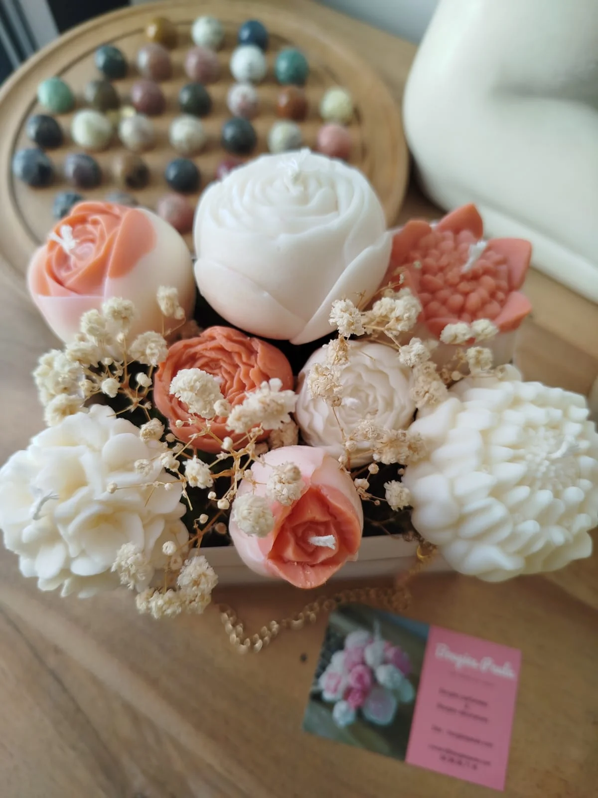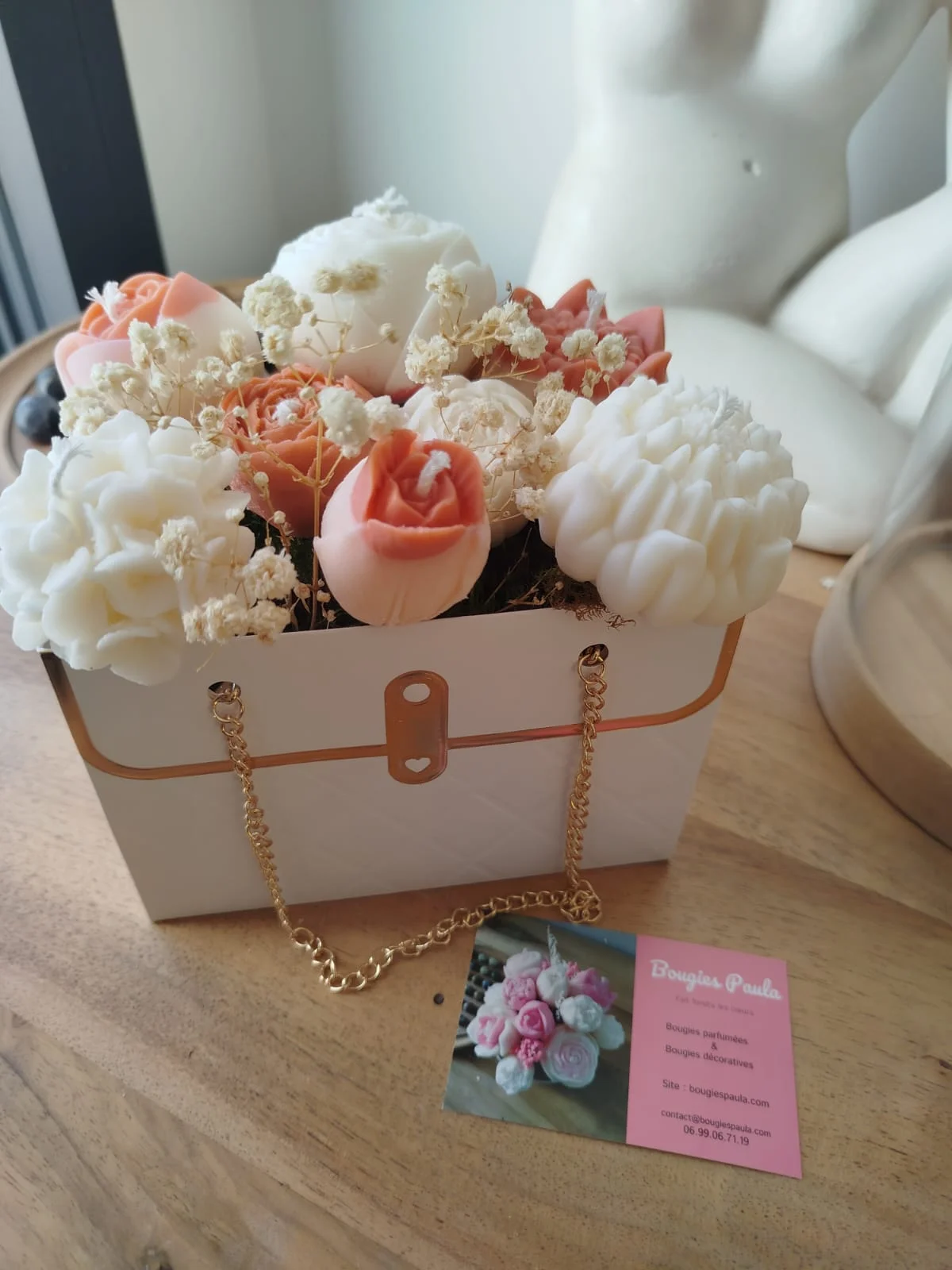 aissez-vous séduire par ce bouquet de fleurs en bougies, une création artisanale raffinée qui associe des teintes naturelles et terracotta chaleureuses à un contenant résolument élégant.