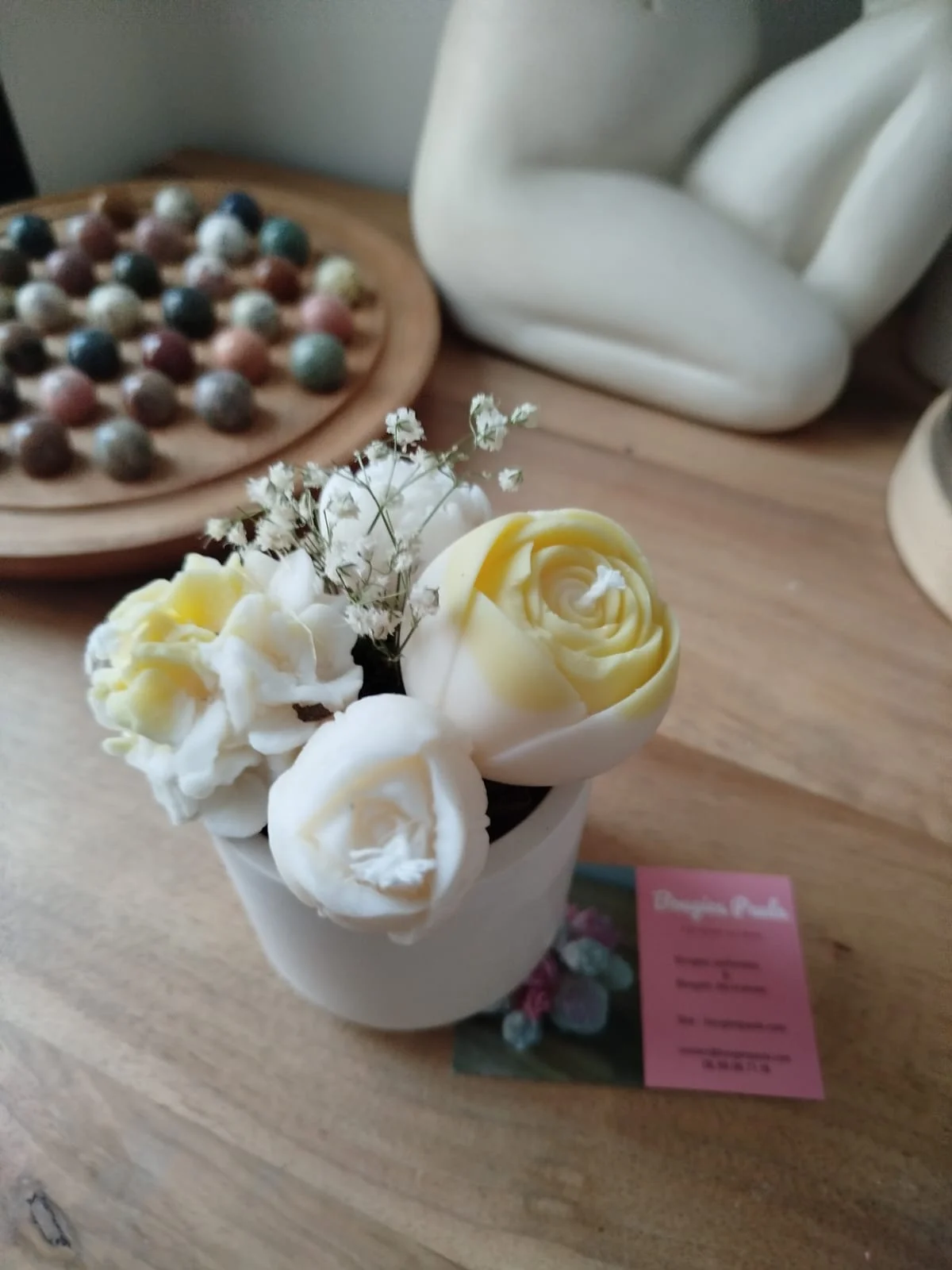 Chaque fleur est coulée à la main en cire végétale, puis disposée avec soin dans un pot en plâtre artisanal au fini mat et minéral.