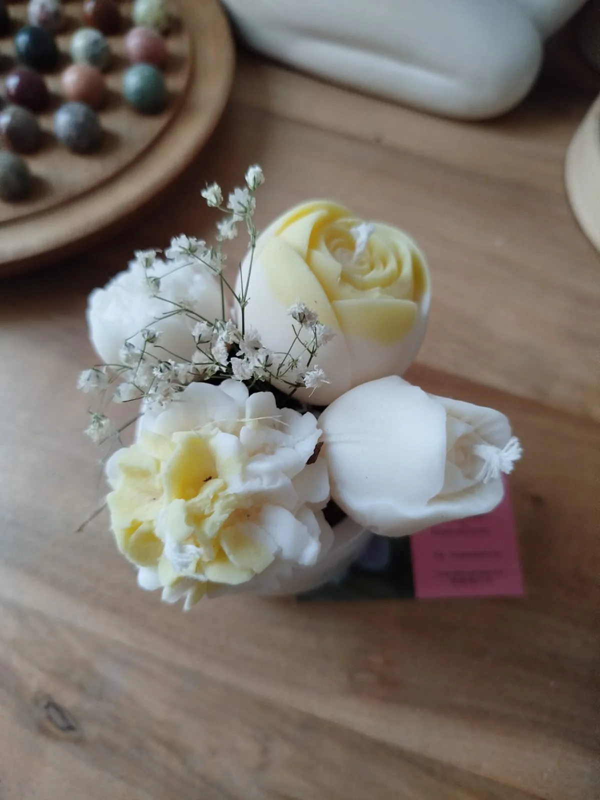 Cette composition florale en bougies apporte une touche de fraîcheur et de gaieté, parfaite pour une décoration printanière et chaleureuse.